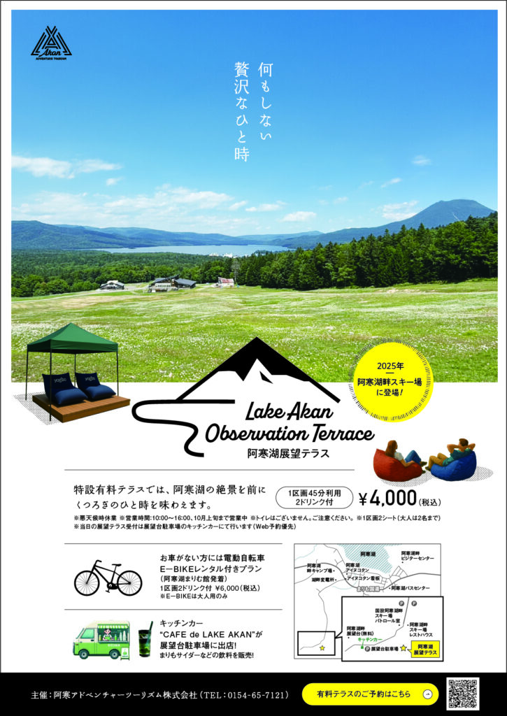 2025年4月1日より国設阿寒湖畔スキー場の指定管理者となりました。 冬季だけでなく、夏季シーズンでスキー場を利用してイベント実施等ご相談がありましたら、ご連絡下さい。 スキー場中腹にある阿寒湖を見下ろす展望台は6月にOPEN予定です。 今年からは展望台でのサービスも計画しております。(7月より随時開始) 阿寒湖と雄阿寒岳の景観を楽しめる場所です。 (展望台がOPENするまではスキー場には入場することができません)